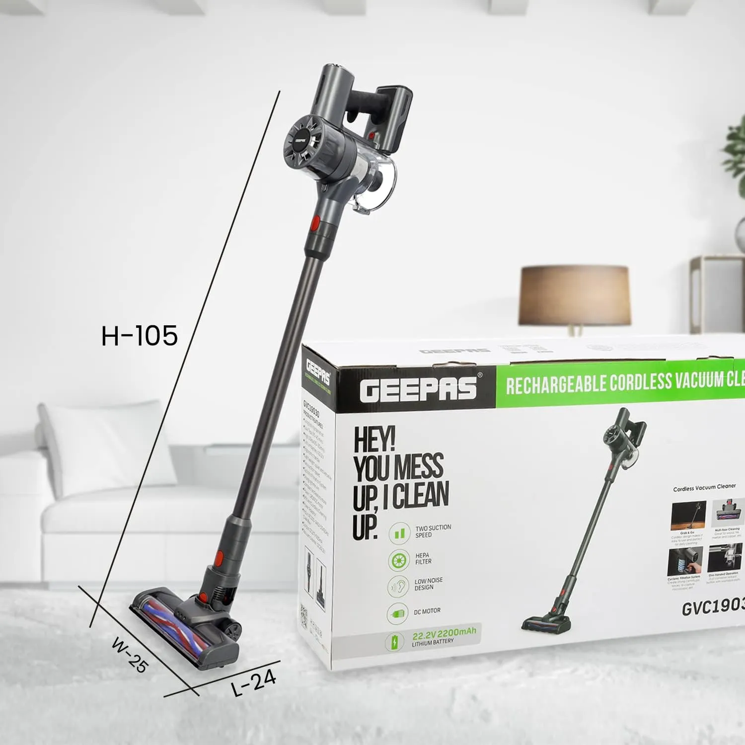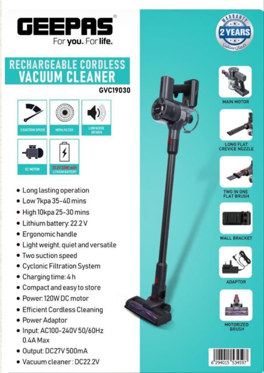 جاروبرقی بیسیم جیپاس مدل GVC19030 یک جاروبرقی بیسیم همهکاره ۲ در ۱ است که برای نظافت کارآمد منزل طراحی شده است. طراحی سبک و باتری لیتیومی قدرتمند ۲۲.۲ ولتی آن، آن را برای سطوح مختلف، از جمله کفهای سخت و فرش، مناسب میکند.